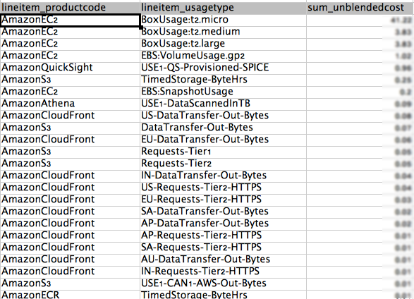 sum(cast(lineitem_unblendedcost AS double)) AS sum_unblendedcost